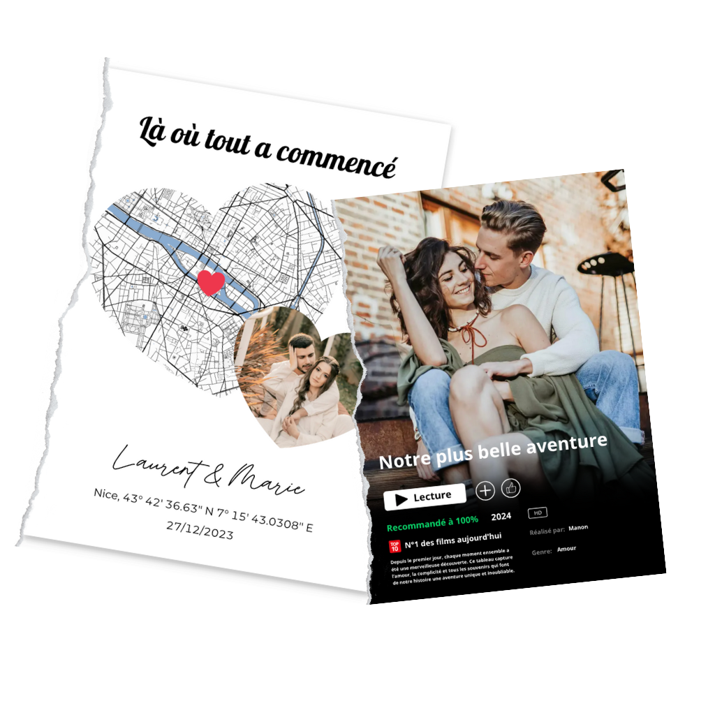 Créez des souvenirs qui dureront toute une vie grâce à nos cadeaux personnalisés. Mugs, cadres, vêtements et plus encore, pensés pour célébrer l’amour de façon inoubliable.