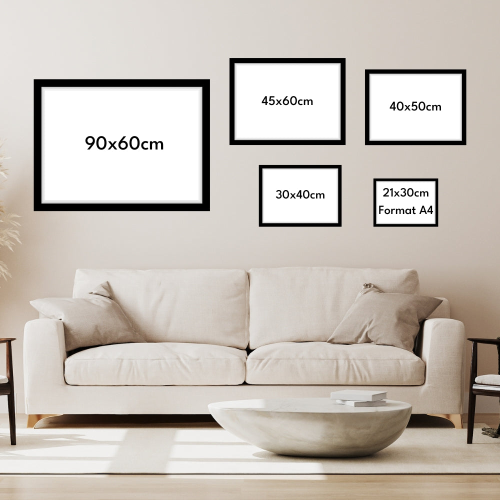Notre gamme de cadre personnalisés, disponibles en plusieurs formats, du grand 90x60 cm au plus petit 21x30 cm (format A4). Trouvez la taille idéale pour mettre en valeur vos photos personnelles et créez une décoration unique qui reflète vos souvenirs dans votre espace.