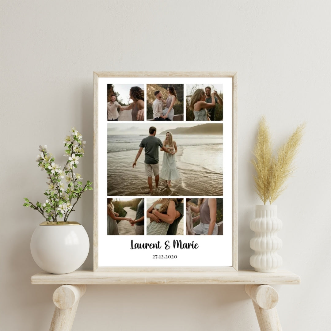 Offrez à votre couple un cadeau unique avec notre cadre personnalisé ! Sélectionnez vos plus belles photos et ajoutez vos prénoms ainsi qu’une date marquante, pour créer un souvenir inoubliable. Ce cadre apportera une touche d’élégance et de romantisme à votre quotidien, vous rappelant à chaque instant les moments précieux partagés ensemble et l’histoire d’amour qui vous unit.