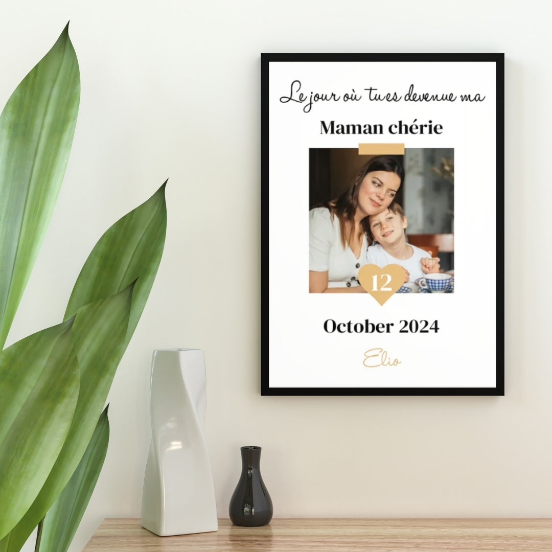 Offrez à votre maman un cadeau unique avec notre cadre personnalisé ! Ajoutez une photo pleine de tendresse et la date, pour immortaliser le moment où elle est devenue votre maman chérie. Ce cadre apportera une touche d’amour et de reconnaissance à son quotidien, lui rappelant à chaque instant les souvenirs précieux partagés et le lien unique qui vous unit.