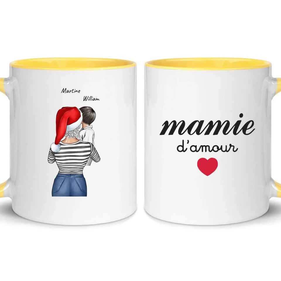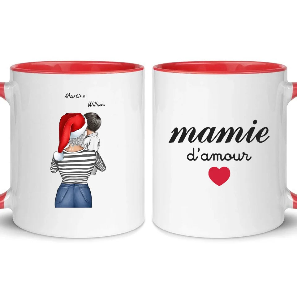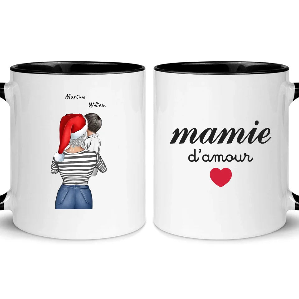 Offrez un cadeau plein de tendresse avec la tasse "Mamie Noël" personnalisée avec les prénoms des enfants. Parfaite pour célébrer les fêtes, cette tasse unique accompagnera chaque chocolat chaud de Mamie avec amour. Un souvenir chaleureux et inoubliable pour Noël.