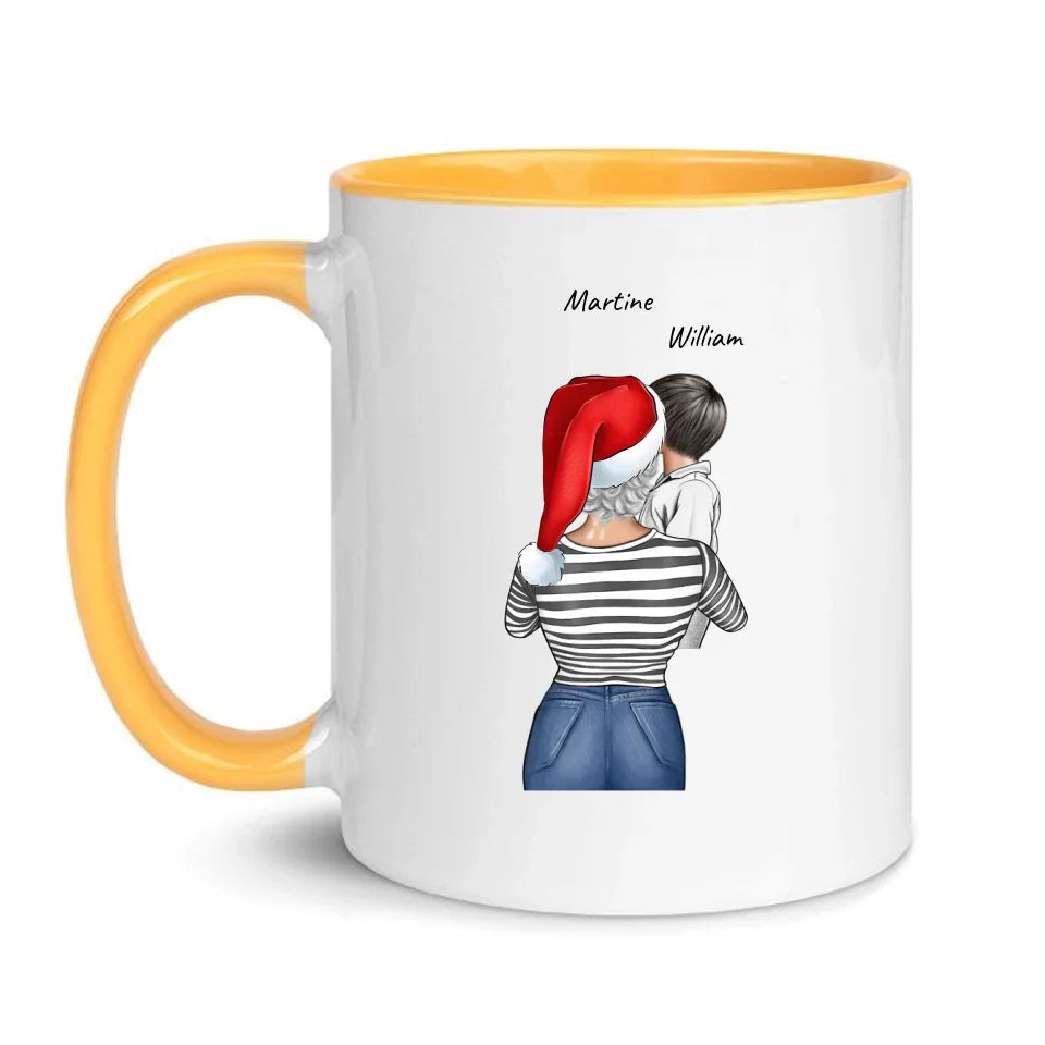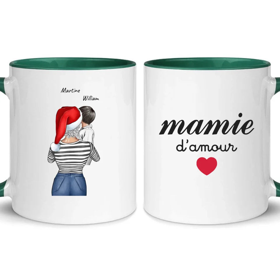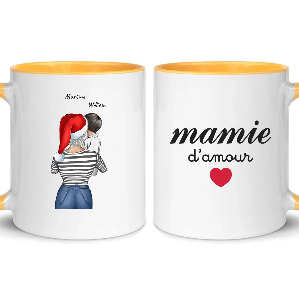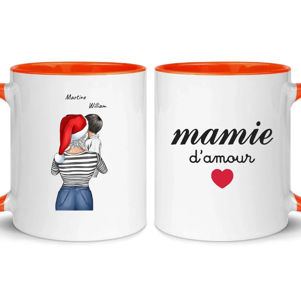 Offrez un cadeau plein de tendresse avec la tasse "Mamie Noël" personnalisée avec les prénoms des enfants. Parfaite pour célébrer les fêtes, cette tasse unique accompagnera chaque chocolat chaud de Mamie avec amour. Un souvenir chaleureux et inoubliable pour Noël.