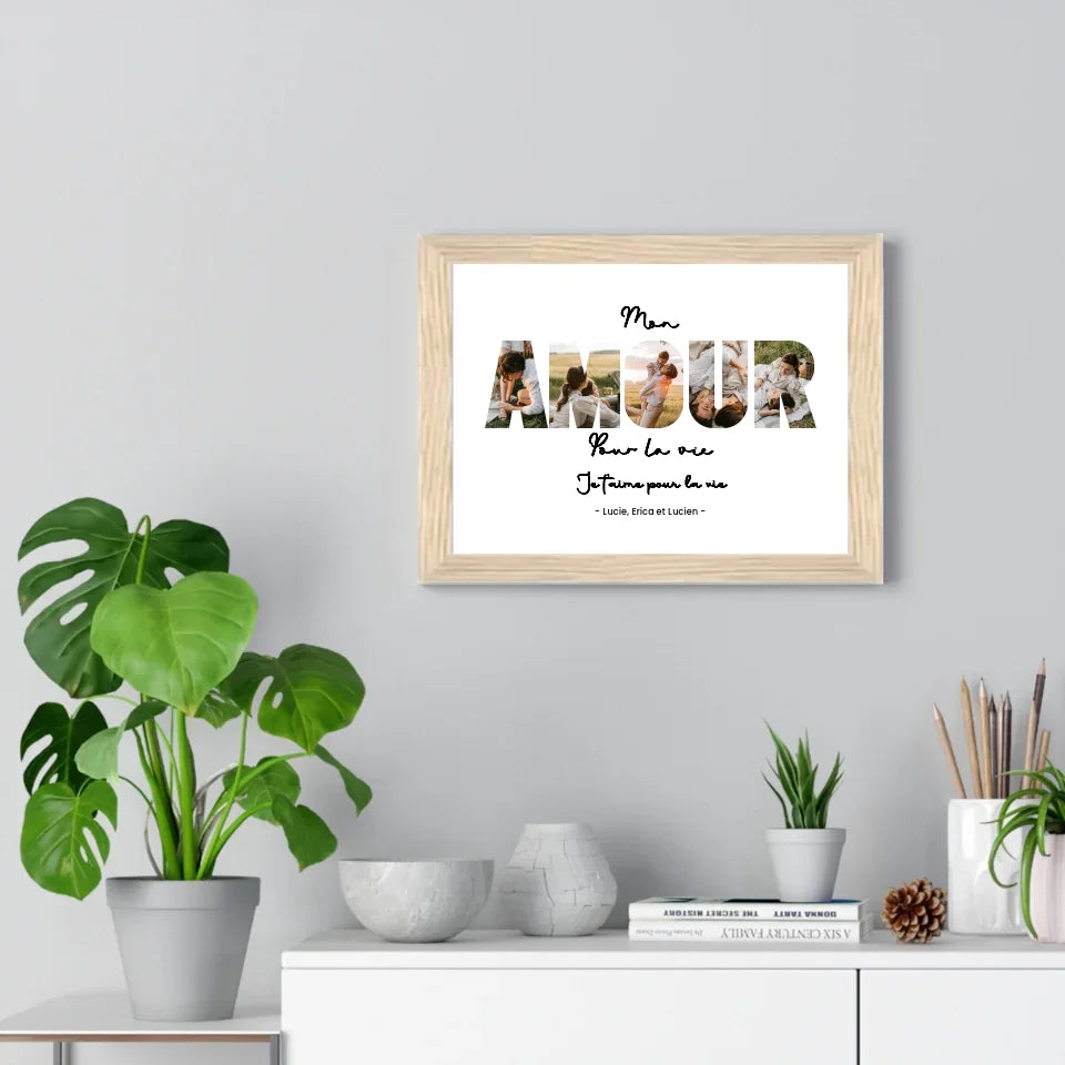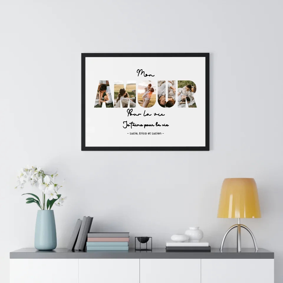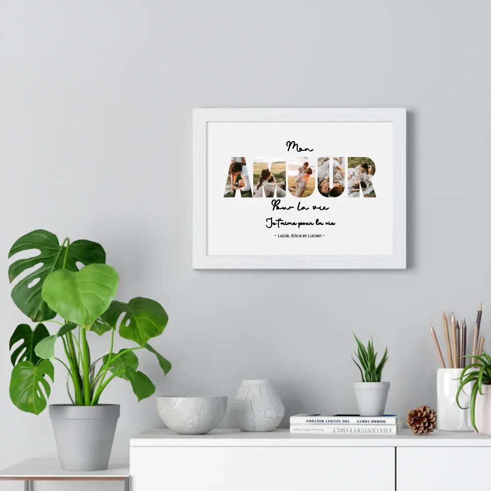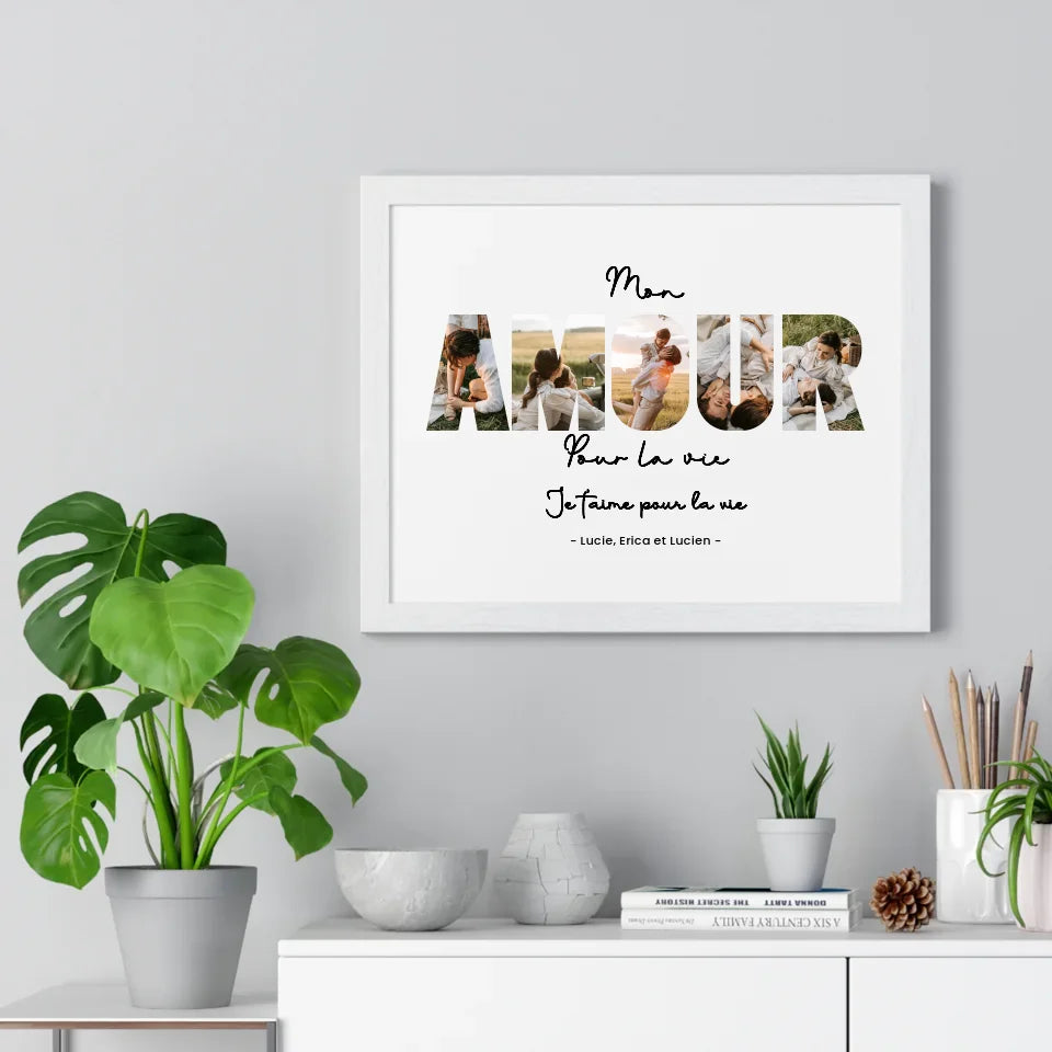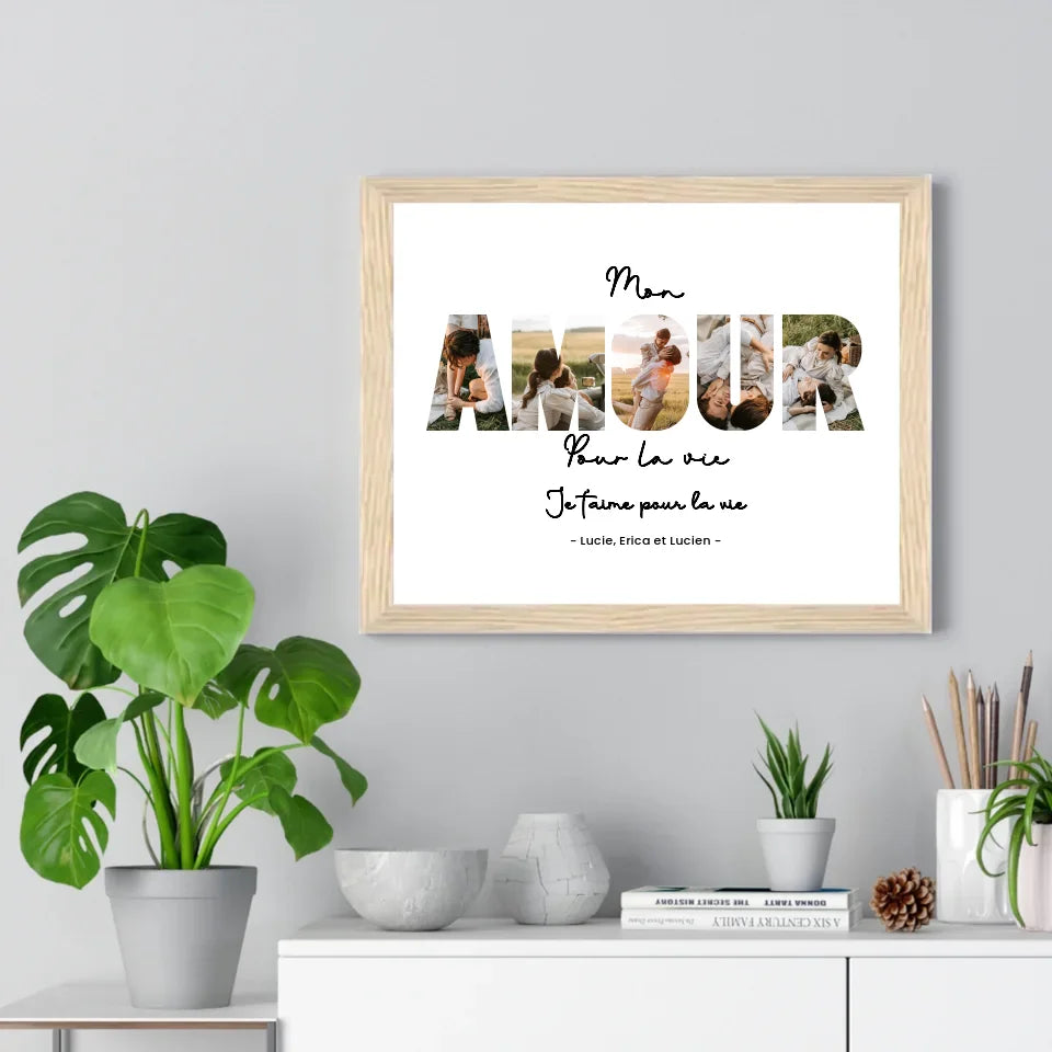 Offrez un souvenir inoubliable avec le cadre "Amour" personnalisé avec vos plus belles photos. Idéal pour célébrer un couple, un anniversaire ou la Saint-Valentin, ce cadre unique met en valeur vos moments précieux. Créez facilement une décoration pleine d'émotions et de romantisme.