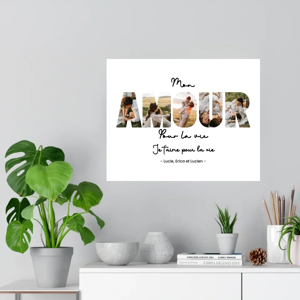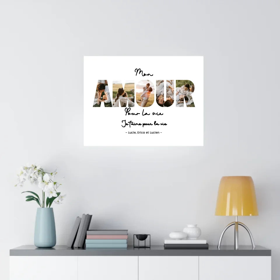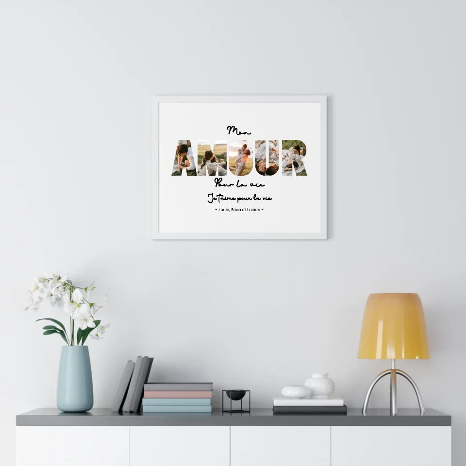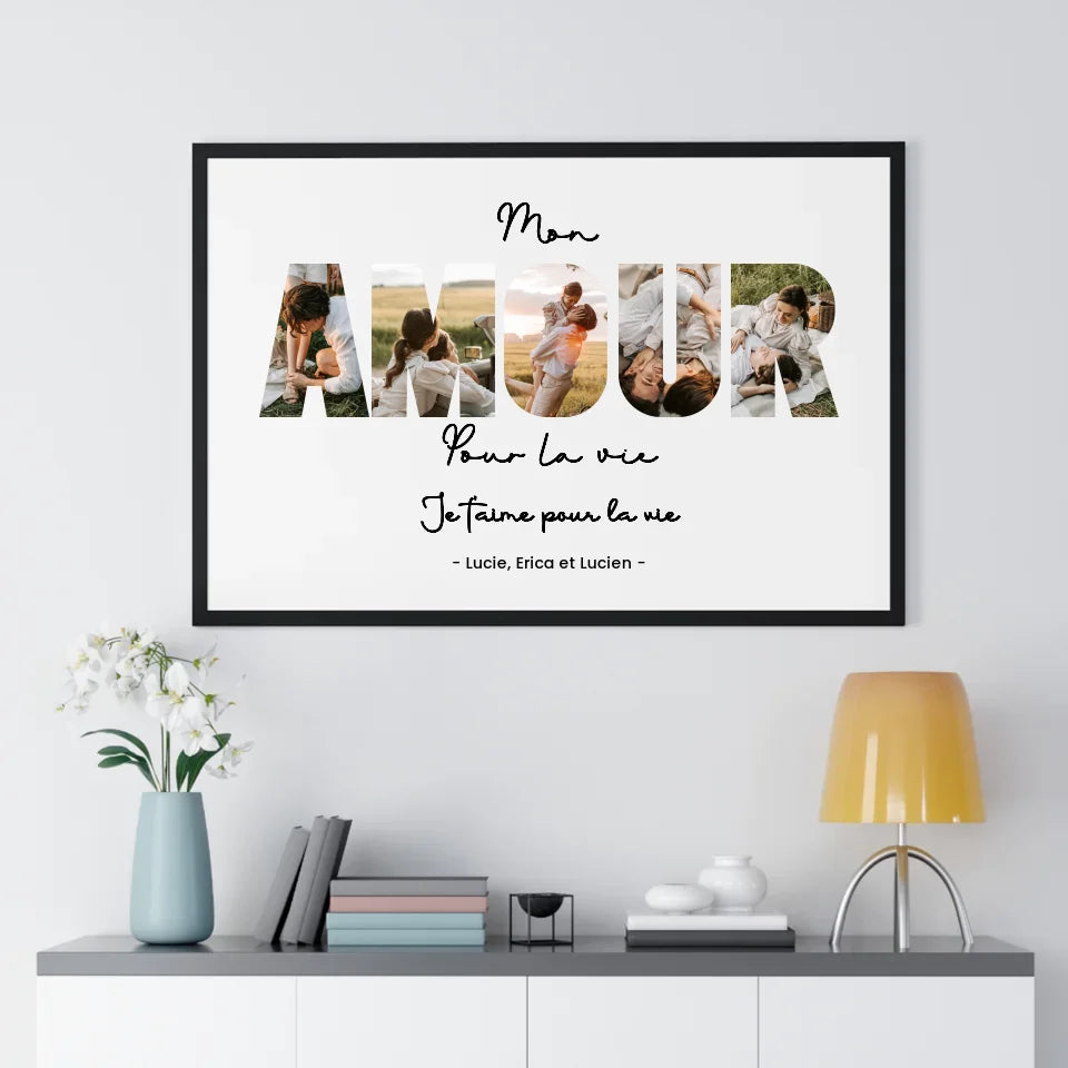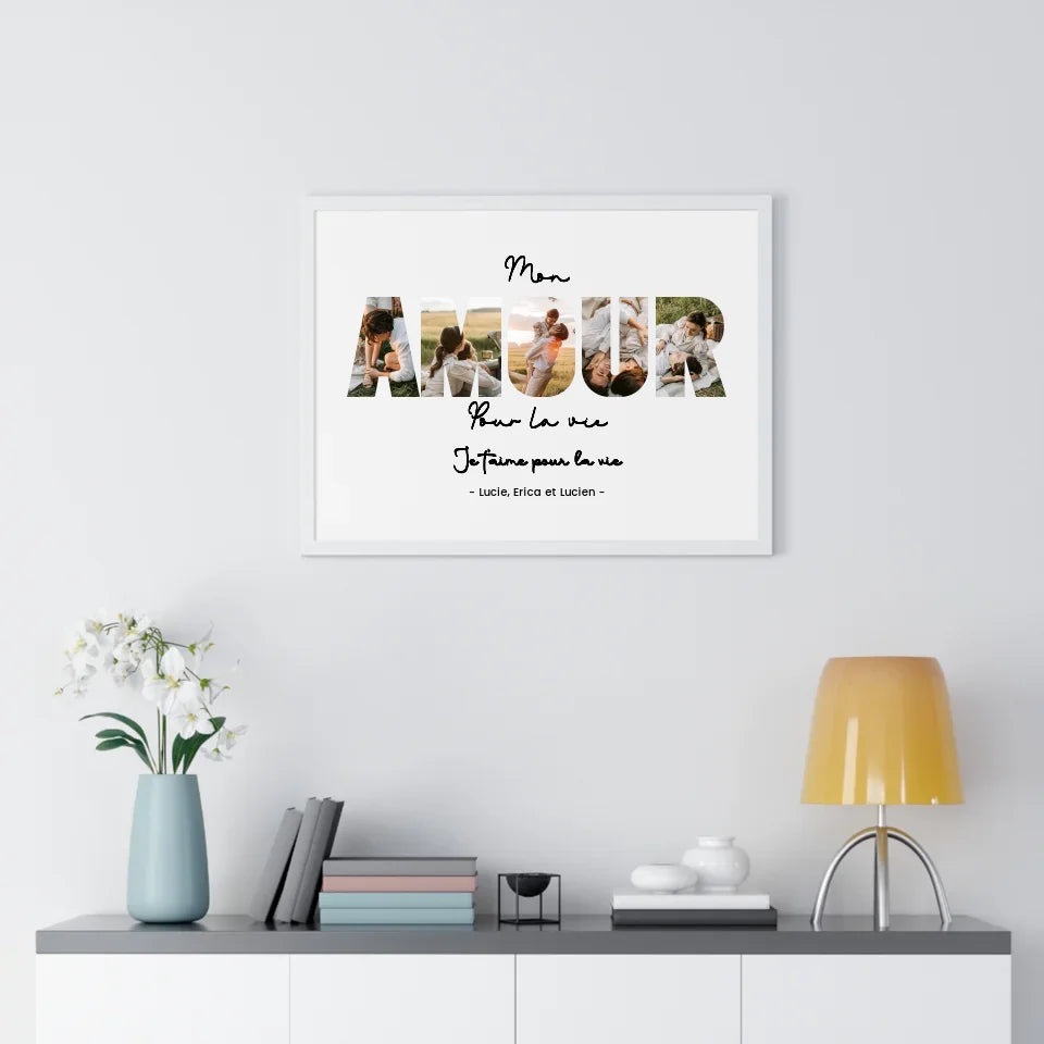 Offrez un souvenir inoubliable avec le cadre "Amour" personnalisé avec vos plus belles photos. Idéal pour célébrer un couple, un anniversaire ou la Saint-Valentin, ce cadre unique met en valeur vos moments précieux. Créez facilement une décoration pleine d'émotions et de romantisme.