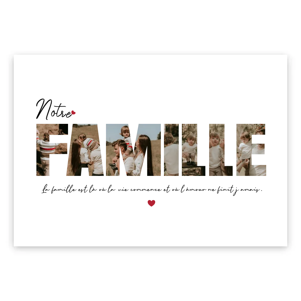 Offrez à votre famille un cadeau unique avec notre cadre personnalisé ! Ajoutez vos photos les plus précieuses et un message touchant, comme "La famille est là où la vie commence et où l’amour ne finit jamais", pour créer un souvenir inoubliable. Ce cadre apportera une touche d'amour et de chaleur à votre intérieur, rappelant chaque jour la beauté et la force des moments partagés en famille.