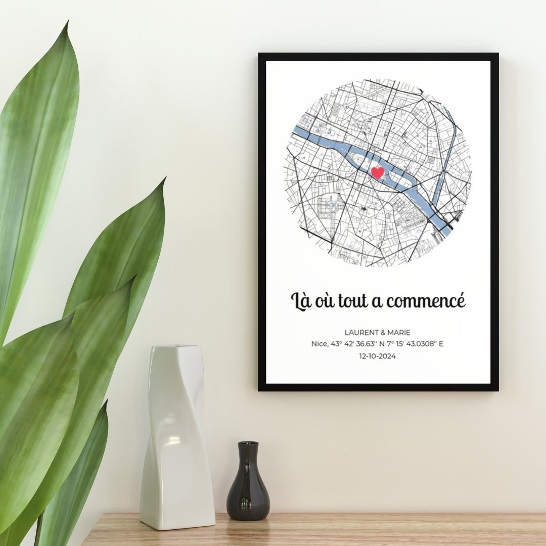 Représentez le lieu où tout a commencé pour vous avec une carte personnalisée et les coordonnées géographiques précises.